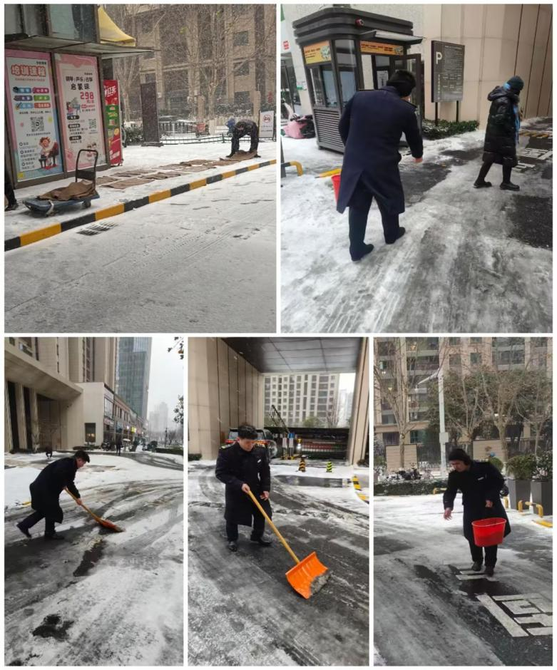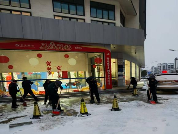 在居民小区,他们弯腰挥锹、奋力扫雪,从单元门口到小区主干道,一点点铲除冰层、归集积雪,为早起出行的居民开辟出安全通道;在工业园区,他们加密巡逻频次,对关键区域反复除冰,还有一部分人坚守门岗,对进出车辆进行防滑提醒,引导有序通行;在商业街区,他们分工协作,有的清理车辆出入口,有的在台阶上铺防滑垫、设警示标识,确保企业员工通勤不受影响;在学校周边,他们提前抵达岗位,赶在学生上学前清理完校门口及周边道路的冰雪,为孩子们的安全出行保驾护航。