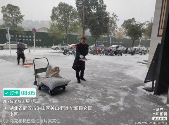 连日来,湖北遭强冷空气侵袭,寒潮携雨雪而至,气温骤降。1月20日凌晨,大范围雨雪致路面积雪冰冻,给市民出行安全和城市安保工作带来考验。面对这场“冻”考,湖北领威保安服务有限公司全员齐心,管理层靠前指挥,一线队员冲锋在前,迅速落实举措开展防寒除冰工作,展现新时代安保人的使命担当。